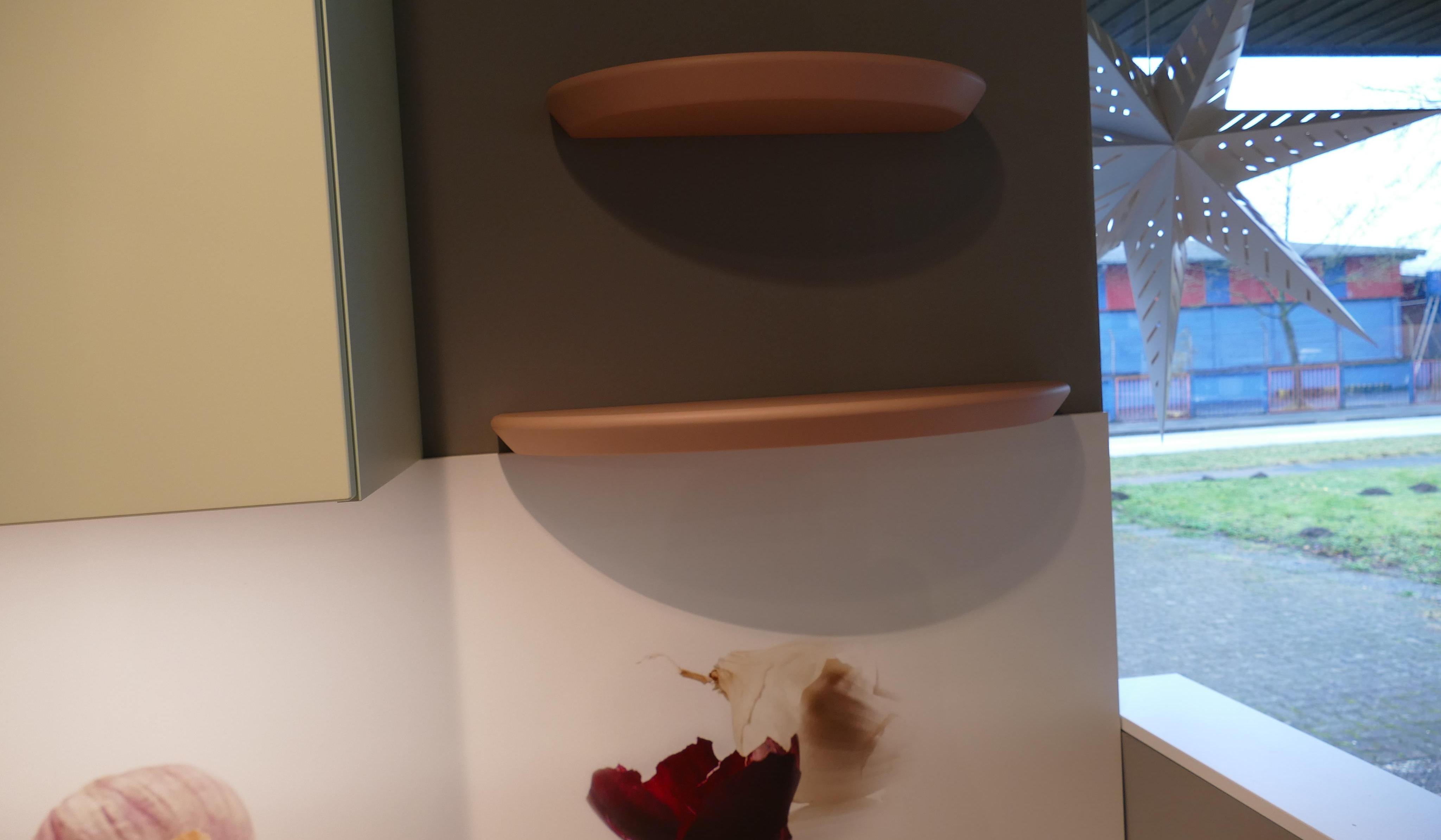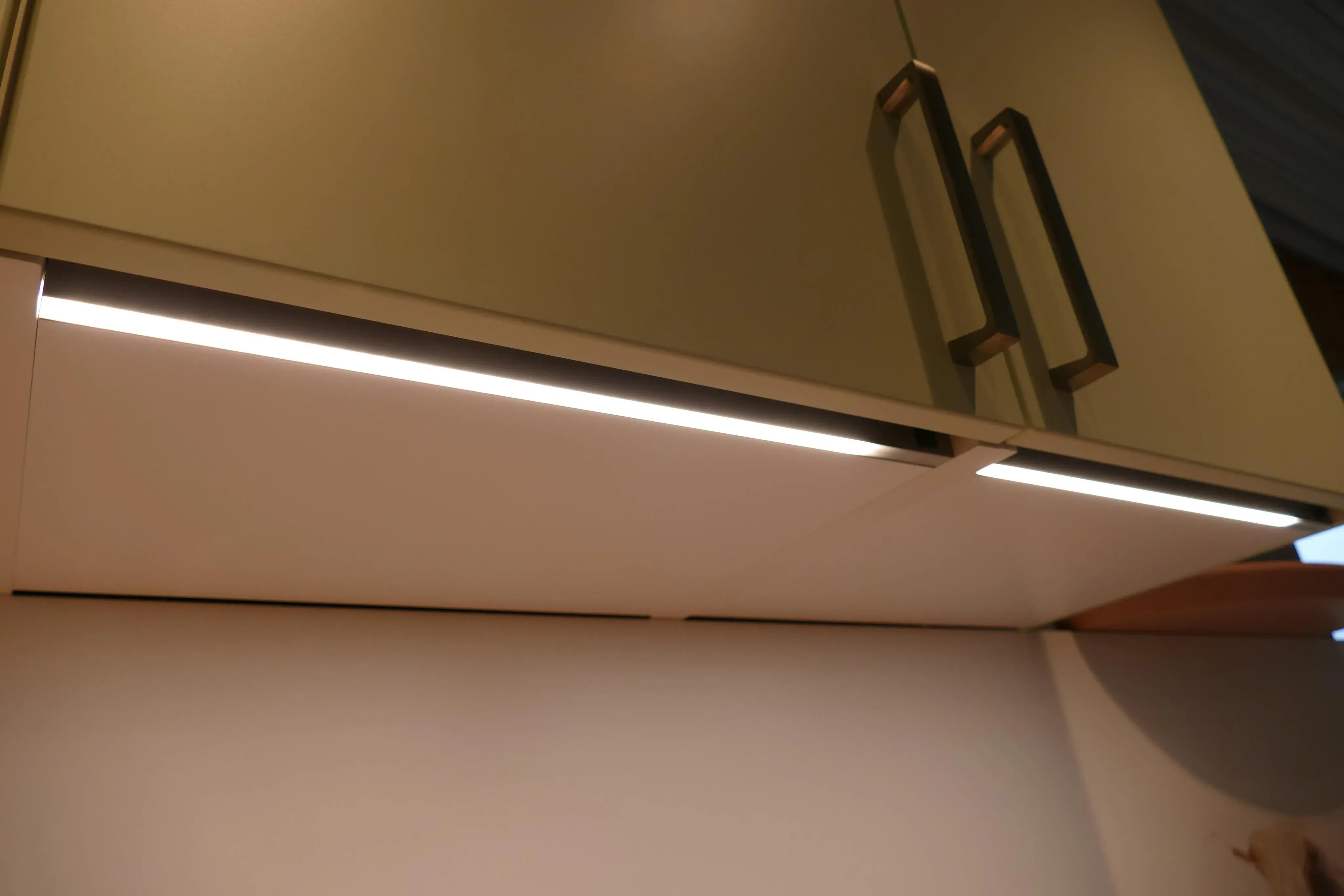 Hinter den Türen der Oberschränke befinden sich beleuchtete Griffleisten, welche den Arbeitsbereich beleuchten.