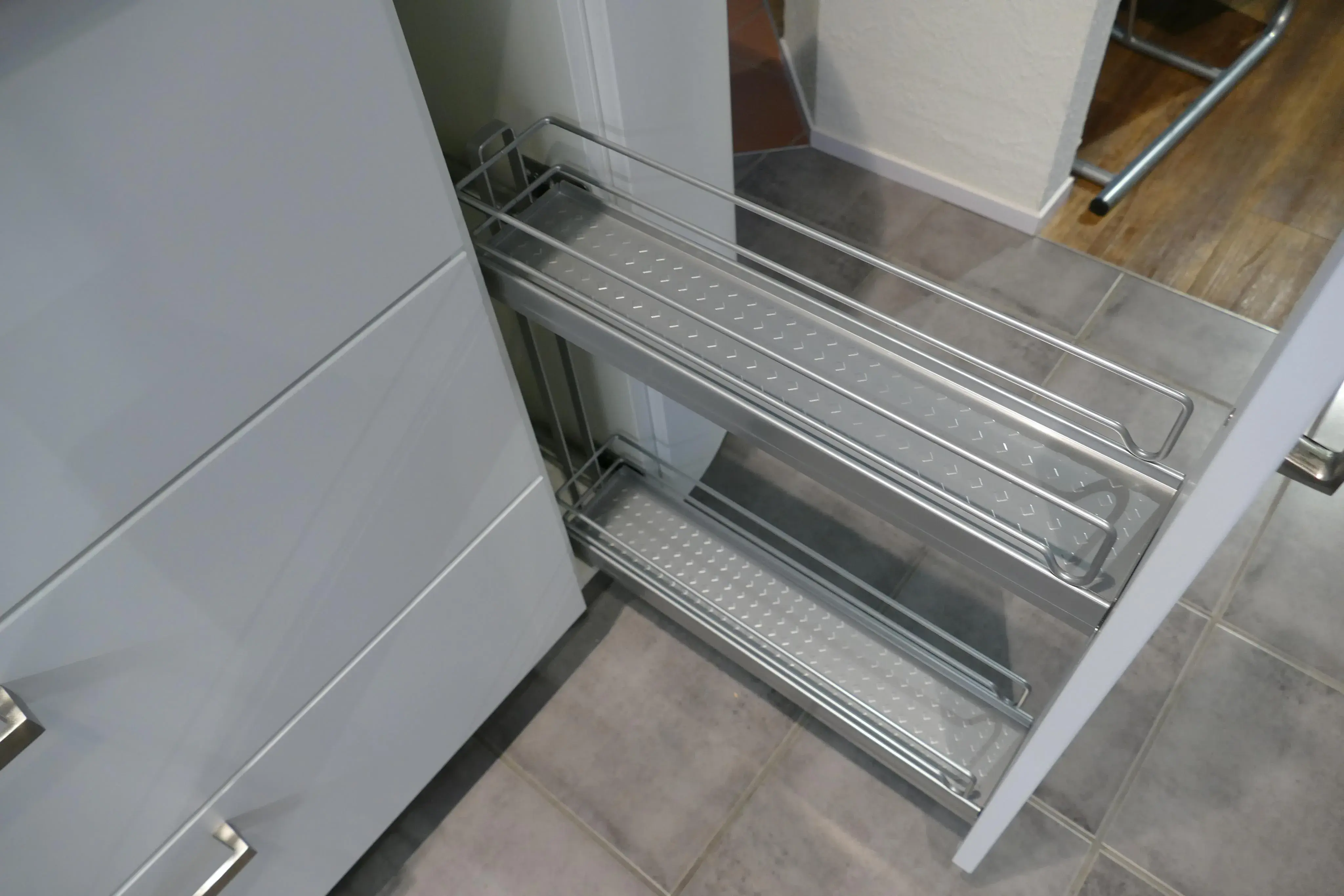 Rechts neben dem Kochfeld befindet sich ein 150 mm breiter Auszugschrank mit 2 Strukturmetalletagen.