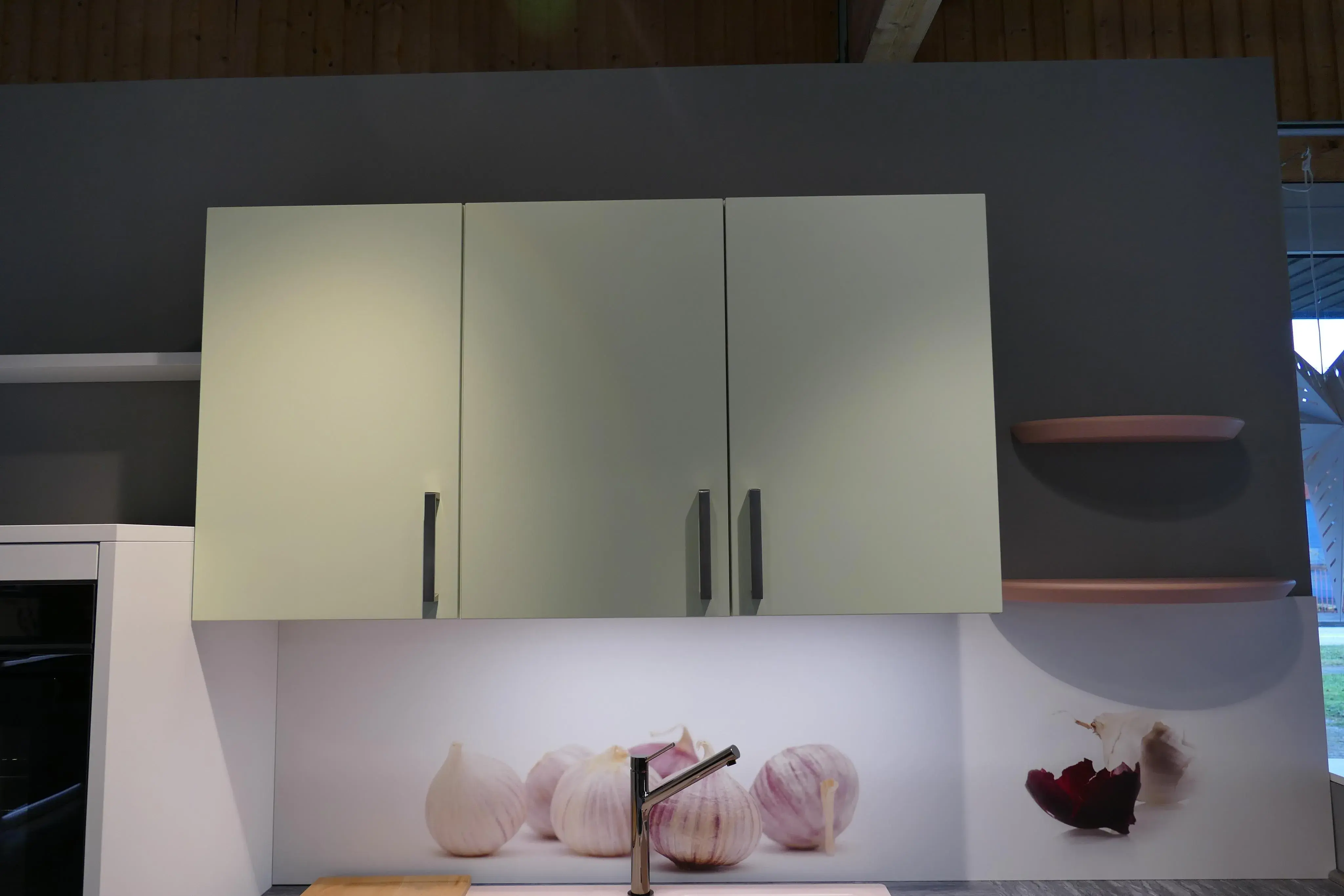 Musterküche Abverkauf Schüller Küche Biella in Kristallweiß mit Oberschränken in Pastellgrün